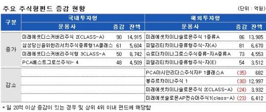 사흘 만에 다시 역전됐다. 지난달 30일 국내 주식형펀드의 자금 유입 규모는 1200억원으로, 해외 주식형펀드 증가액 430억원을 크게 앞섰다.