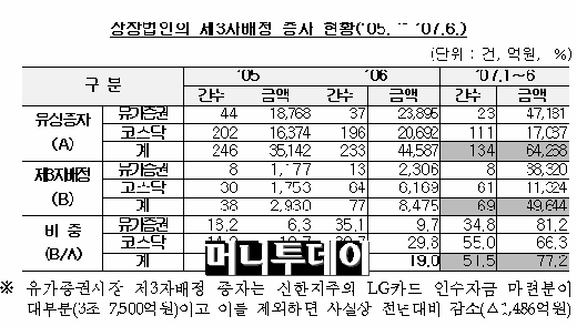 올 6월말 현재 제3자 배정 증자 규모는 4조9644억원으로 전년대비 4조1169억원(485.8%) 급증했다.신한지주(100,900원 ▲3,000 +3.06%)가 LG카드 인수를 위해 실시한 유상증자를 제외하더라도 전년대비 3669억원(43.3%) 증가했다.
