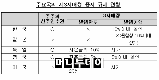 아울러 금감원은 제3자 배정 증자 발행가액 산정 방식을 변경하고 발행한도를 제한하는 방안도 검토하기로 했다. 미국과 영국, 일본 등에서는 발행한도와 발행가액 산정시 할인율 등을 엄격히 제한하고 있다.