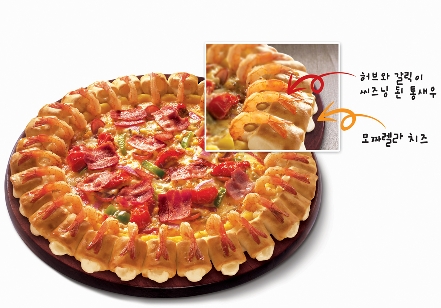 지난 6월 한국피자헛은 신메뉴 '통새우 치즈바이트'를 선보였다. 피자 가장자리에 28마리의 통새우를 한마리씩 올린 기상천외한 피자다.