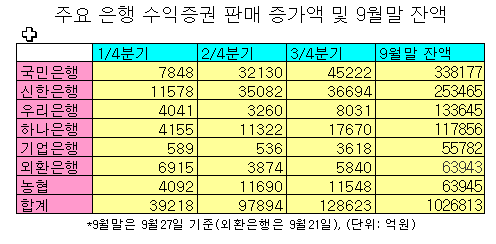 증시 호황으로 주목받는 수익증권 판매에서는 국민과 신한은행이 선두권을 형성했다. 국민은행은 3/4분기 수익증권 판매잔액이 4조5222억원 증가했고, 신한은행은 3조6694억원 늘어났다. 하나은행이 1조7670억원으로 3위, 농협이 1조1548억원으로 4위, 우리은행은 8031억원으로 5위에 그쳤다.
