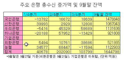우리은행의 총수신은 3/4분기 5조8689억원이 늘어나 국민(1조8639억원) 신한(1조2808억원) 하나(-1조3429억원) 등 다른 '빅4' 은행을 압도했다. 상반기 수신이 급증했던 농협은 3/4분기 1조1594억원 감소했다. 외환은행은 3조8686억원 증가해 주요 은행 중 2위에 올랐다.
