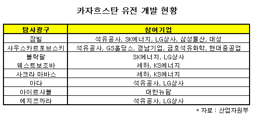 현재 국내 업체 중에는 석유공사·LG상사 등 12개사가 잠빌 등 8개 광구에서 탐사작업을 벌이고 있다. 2004년 9월 노무현 대통령이 카자흐스탄을 방문해 자원개발협력 토대를 닦은 후 이뤄진 계약들이다.