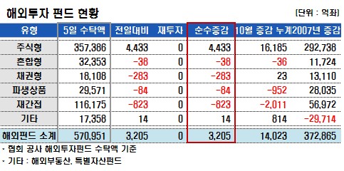 해외주식형펀드는 5일 기준 4433억원 증가한 35조7386억원을 기록했다. 특히 홍콩투자 비중이 높은 중국펀드로 자금 유입이 급증하고 있다.