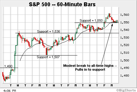 S&P500지수의 60분차트가 사상최고가 돌파의 흐름을 잘 보여준다. 3주간의 공방 끝에 저항선을 넘었고 1550을 지지선으로 확보하는데 성공한 것이다. 이를 지지삼아 S&P500지수는 숨고르기 이후 이번주 다시 상승했다.