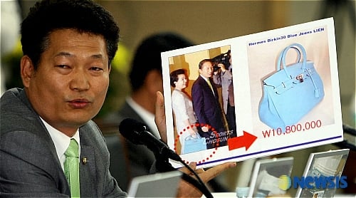 송 의원은 "1만5000원의 건강보험료를 냈던 이명박 후보의 부인은 1000만원짜리 명품 핸드백으로 치장한다고 인터넷 블로그에 퍼져있다"고 지적한 뒤 "수백억대 자산가인 이 후보의 건보료는 허위 신고된 의혹이 있다"고 주장했다. 실제 송 의원이 이날 국감장에서 공개한 사진에는 핸드백 가격인 듯 '₩10,800,000'라고 쓰여있었다.