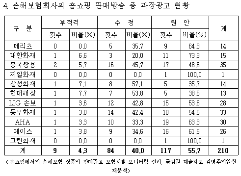 생명보험 판매방송의 경우 58.8%가 과장광고였으며, 손해보험 판매방송은 44.3%가 과장 광고였다.