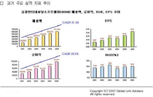 매출과 이익은 순이익이 2004년에 일시적으로 떨어진 것을 제외하고는 지속적으로 안정적인 속도(연율 평균 25~30% 정도)로 성장을 하고 있습니다. ROE는 고수준을 유지하고 있어 과거 3년간 착실하게 효율이 상승하고 있습니다. 다른 일부 업종같이 급 확대 성장을 하고 있는 것은 아니지만 중국의 IT화 시장 상황에 맞추어 착실하게 성장하고 있다고 생각합니다.
