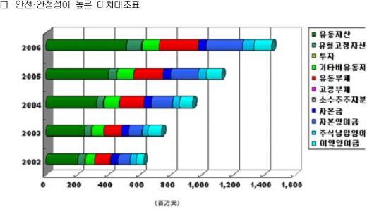 그래프 녹색 계열은 자산, 붉은 계열은 부채, 파란 계열은 주주자본을 합한 것으로 3 분야의 균형이 안정적으로 분배되어 있어 지극히 안전성이 높은 재무 내역을 보이고 있습니다.