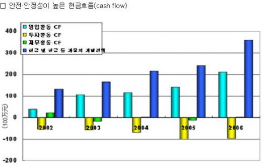 착실하게 영업 캐쉬플로우(cash flow)를 벌어들이고 있으며, 그 범위 내에서 매년 조금씩 투자 캐쉬플로우(cash flow)를 이용해 무형 고정자산등을 저축하고 있습니다. 프리캐쉬플로우(cash flow)가 매년 늘어나고 있어 당장은 증자도 새롭게 할 필요가 없는 상황입니다. 결과적으로 현금잔고가 증가해 윤택한 재무 상황을 가지고 있습니다.