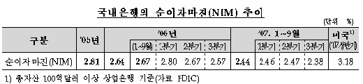 금감원 김대평 부원장은 “은행의 당기순이익 규모는 늘어났지만 이는 출자전환 주식매각 등 일시적 요인 때문”이라며 “구조적이익률이나 순이자마진 등 수익창출능력을 나타내는 핵심지표들은 부진한 모습”이라고 설명했다.