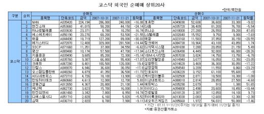 외국인은 최근 상승폭이 가파랐던 코스닥 대장주NHN(210,000원 ▲8,500 +4.22%)을 2241억원 어치 집중적으로 팔아치웠다. 한때 30만원대를 육박하던 NHN은 이 기간 16% 가량 급락하며 24만원대로 내려앉았다.