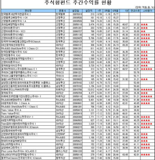 설정액이 1조원을 넘는 대형펀드 중에서는 '한국삼성그룹적립식주식 1Class A'의 주간수익률이 -8.71%로 가장 저조했다. 미래에셋자산운용의 설정액 1조원 이상 대표 펀드들도 수익률이 저조했다.