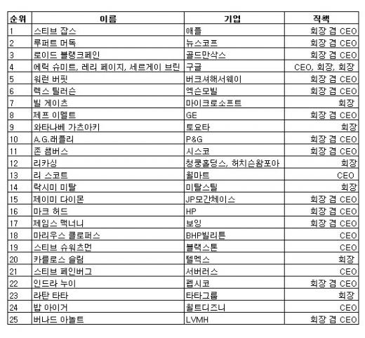 미국 경제 주간지 포춘은 27일(현지시간) 올해의 가장 영향력 있는 25인의 기업인을 선정한 결과 잡스 회장이 1위에 올랐다고 보도했다.