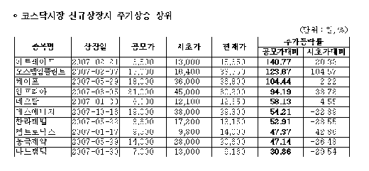 2007년 코스닥의 공모시장 부진으로 코스닥 신규상장주는 상장일 시초가에 파는 것이 가장 높은 수익률을 기록한 것으로 나타났다. 반면 코스피 신규상장주는 상장일 종가로 매도하는 것이 좋은 결과를 나았다.