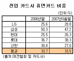 16일 여신금융협회와 신용카드업계에 따르면 올 6월말 현재 전업 카드사의 휴면카드 비중은 33.5%를 기록했다. 이는 지난해말 33.7%에 비해 불과 0.2%포인트 줄어드는데 그친 것이다.
