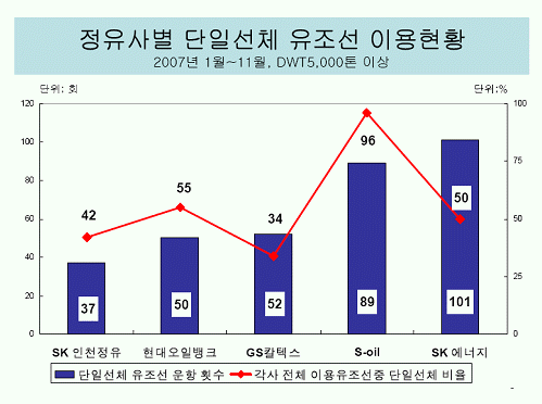 단일선체 유조선 중에서도 5000톤급 이상의 대형 유조선만 따질 경우, SK에너지는 올 한 해 단일선체 유조선 사용 횟수가 148회에 이르렀다. S-오일과 GS칼텍스가 각각 89회, 52회로 뒤를 이었다.
