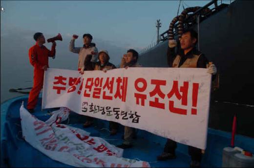 충남 태안군 만리포 북서방 5마일 떨어진 곳에 정박해 있는 홍콩 선적 유조선 '허베이 스피리트호' 앞에서 환경운동연합 관계자들이 지난 18일 "현대오일뱅크는 환경참사 책임져라" "단일선체 유조선 추방" 등 구호를 외치며 해상 시위를 벌였다.
