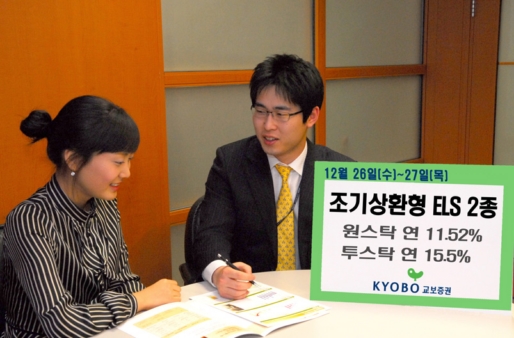교보증권은 연 11.52%와 연 15.5% 수익을 추구하는 조기상환형 주가연계증권(ELS) 2종을 판매한다고 26일 밝혔다. 26~27일 이틀간 판매되며 27일 오후 1시까지 청약이 가능하다.