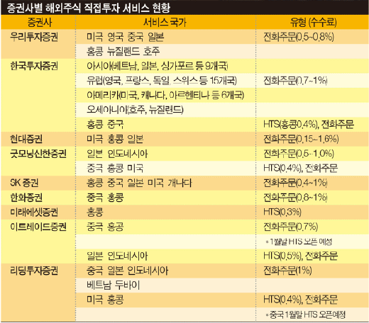 현재 해외주식 직접 투자 서비스를 활발하게 제공하는 국내 증권사로는 한국투자증권, 굿모닝신한증권,우리투자증권(29,750원 ▼2,100 -6.59%),현대증권,한화증권(6,510원 ▼560 -7.92%),SK증권(1,912원 ▼233 -10.86%), 리딩증권, 이트레이드증권 등이 있다.미래에셋증권도 지난해 연말부터 HTS를 통한 홍콩주식 직접 매매 서비스를 제공하고 있다.