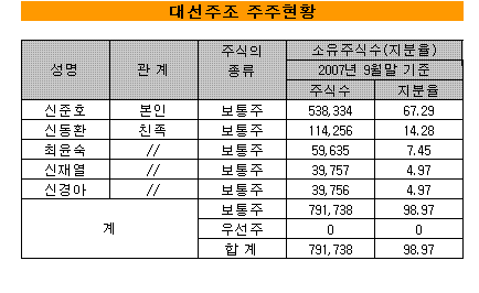 대선주조는 2002년 상장폐지된 후 2년 가까이 무학소주의 경영권 장악시도에 시달린 바 있다. 신준호 회장은 이때 대선주조 지분을 대거 인수하며 최대주주로 자리잡았다.