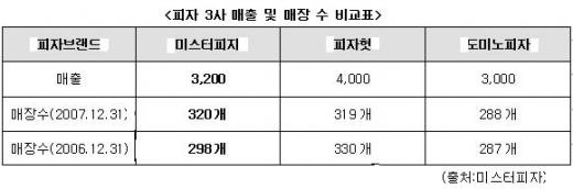 매장수면에서는 지난해 12월31일 기준으로 미스터피자가 320개로 가장 많아 319개인 피자헛을 앞질렀다. 도미노피자는 288개 수준.