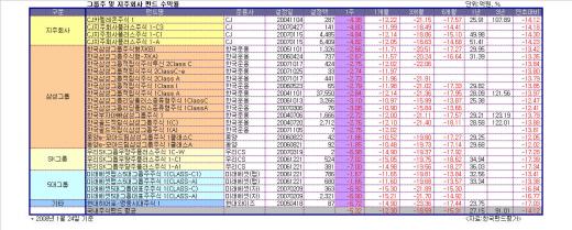 삼성그룹주 펀드는 하락장을 잘 이겨냈지만 IT의 비중이 적은 우리CS운용의 'SK그룹주펀드'와 미래에셋운용의 '5대그룹 대표주펀드', CJ운용의 '지주회사펀드'등은 고전했다.