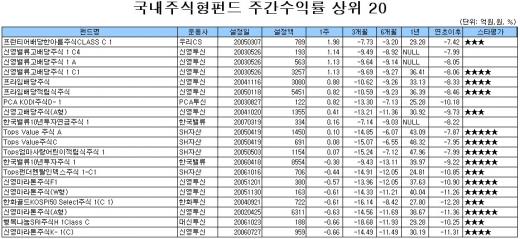 국내주식형펀드는 조선주가 큰 폭으로 하락하는 등 업종별 등락이 엇갈린 가운데 코스피지수(-2.30%)보다 평균 손실이 확대됐다. 반면 통신주 등 편입종목이 약세장에서 방어능력을 발휘하면서 다수의 가치·배당주펀드 수익률이 플러스로 반전돼 주간수익률 상위를 차지했다.