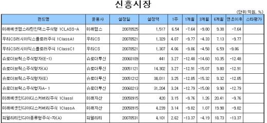 '미래에셋맵스라틴인덱스주식형 1CLASS-A'(6.54%), '우리CS러시아익스플로러주식 1ClassA1'(4.07%), '슈로더브릭스주식형자(E)'(3.25%), '미래에셋인디아디스커버리주식 1ClassI'(3.15%)를 비롯한 브릭스 등 신흥시장 펀드의 수익률도 플러스로 전환했다.