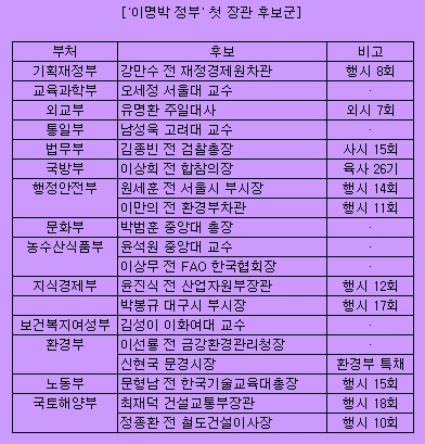 새 정부 출범을 2주 남긴 시점. 청와대 수석 진용이 꾸려진 가운데 이제 내각 인선만 남았다. 지난 설 연휴를 지나면서 이명박 대통령 당선인의 인선 구상은 마무리된 것으로 보인다.