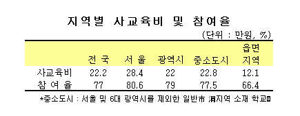 ◆서울과 읍·면 배 이상 격차=지역간 지출 격차도 컸다. 서울 지역이 1인당 월평균 사교육비는 28만4000원인 반면 중소도시와 읍·면 지역은 각각 22만8000원과 12만1000원을 나타냈다. 서울은 사교육비를 받지 않은 비율이 19.4% 였지만, 읍·면지역은 33.6%에 달했다. 1인당 사교육비로 월평균 50만원 이상 지출하는 비율도 서울은 16.5%인 반면 읍·면지역은 1.3%에 그쳤다. 전문계 고등학교를 제외하면 상급학교로 갈 수록 지역별 사교율 격차가 더욱 커졌다.