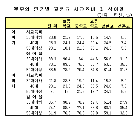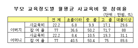 어머니 학력에 따라 그 차이는 더욱 확대됐다. 대졸 이상은 31만1000원, 고졸은 19만3000원, 중졸은 10만5000원, 초졸 이하는 8만4000원을 지출했다. 참여율도 각각 89.6%, 75%, 50.4%, 40.5%로 차이가 났다. 아버지보다 어머니 학력 수준이 사교육에 더 많은 영향을 미치고 있다는 의미다.