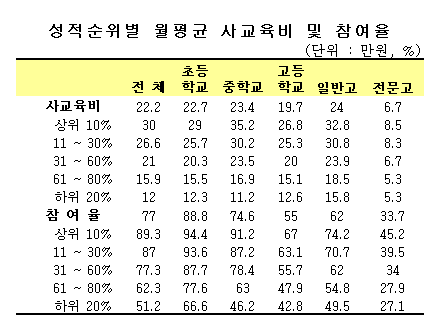 특히 상위 10% 이내 학생은 89.3%가, 상위 11~30%는 87%가 사교육을 받고 있는 반면 하위 20%는 51.2%에 그쳤다.