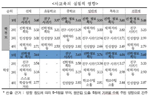 이번 자료에 따르면 모든 학교급에서 학생과 학부모 모두 진학ㆍ학습정보 획득, 친구 사귀기 및 인성 함양 등에 사교육이 효과가 있었다는데 높은 동의를 보였다. 체력 저하와 스트레스 증가, 학교수업 소홀 등의 부정적인 영향은 긍정적인 영향 뒤로 밀렸다.