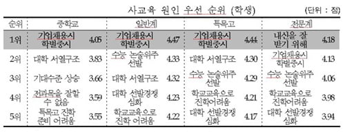 이들은 공통적으로 수능 논술 위주 대입(4.39~4.40점), 기업채용시 학벌 중시(4.12~4.36점), 내신을 잘 받기 위한 것(4.22~4.24점), 대학선발 경쟁 심화(4.24~4.27점), 대학 서열 구조(4.21점), 학교 교육으로는 진학이 어려움(3.93~4.25점) 등을 지적했다.