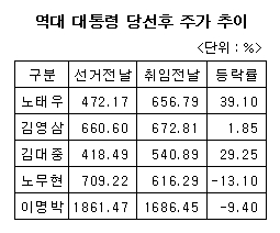 노 대통령 당선후 주가가 많이 떨어졌지만 임기 중 가장 높은 상승률을 기록했다. 이 당선인도 마찬가지로 당선후 주가는 떨어졌다.