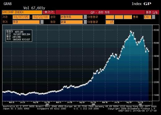 같은 날 중국 증시 상하이종합지수는 3.5% 급락했다. 지난주 막판 3일 연속 하락한 끝에 상하이지수의 주간 하락율은 2.8%를 기록했다. 22일 1.4% 내려선 홍콩 항셍지수의 주간 하락율은 3.5%에 달했다. 상하이와 홍콩증시 올해 하락률은 16% 안팎으로, 아시아증시에서도 낙폭이 큰 상황이다. 미국 경기침체에 동조화된 가운데 폭설 등에 따른 인플레이션 부담까지 겹친 탓이었다.