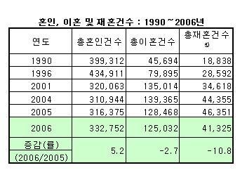 반면 이혼은 12만5032건으로 2.7% 감소했다. 그러나 10년 전인 1996년(7만9895건)에 비해서는 56.5%나 늘어난 수치다. 또 2006년 재혼건수는 4만1325건으로 10.8% 감소했다.