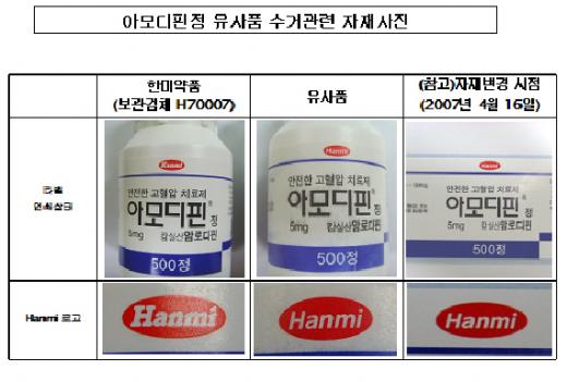 한편 가짜약은 용기 앞면에 붙어 있는 라벨에서 '아모디핀' 등 인쇄된 부분의 글자를 문지르면 인쇄 잉크가 번진다는 점도 차이점이다. 제품을 싸는 완충비닐의 크기도 정품은 '10×50cm'인 반면 가짜약은 '13×20cm'로 크기가 더 컸다.