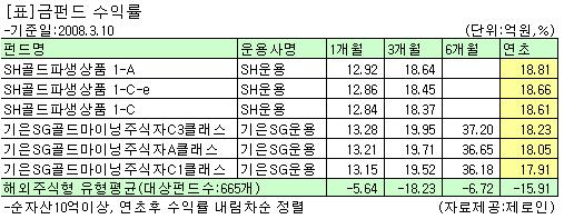 한편 두 개 금 펀드의 편입 자산이 주식과 지수로 상이하지만 수익률에 큰 차이가 없는 것과 관련 제로인 이수진 연구원은 "SH골드파생상품이 금과 관련한 지수를 추종하지만 지수 자체가 기업 주가를 추종하기 때문에 기은SG골드마이닝주식과 수익률이 비슷하다"고 설명했다.