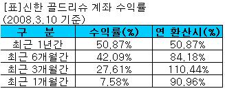 금융업계에 따르면 신한은행의 '골드리슈'는 3월10일 기준 27.61%의 수익률을 기록했다. 연 환산시 110%에 달하는 수익률이다. 최근 6개월과 1년 수익률은 각각 42.09%, 50.87%를 기록해 최근들어 수익률이 급격히 높아진 것으로 나타났다.