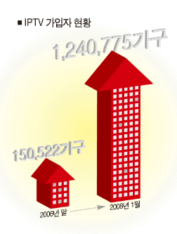 실제로 IPTV는 도입 1년 남짓 만에 130만명이 넘는 가입자를 확보하며 가파른 성장세를 보이고 있다. 국내 IPTV의 시작은 2006년 말 출범한하나로텔레콤의 '하나TV'. 셋톱박스에 원하는 프로그램을 미리 저장해 놓는 '다운로드 앤 플레이' 방식을 도입하며 VOD(주문자형 비디오 서비스)서비스를 제공하는데 성공한 하나TV는 현재 85만명의 가입자를 확보하며 IPTV시장의 선두를 달리고 있다.