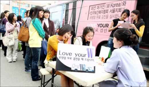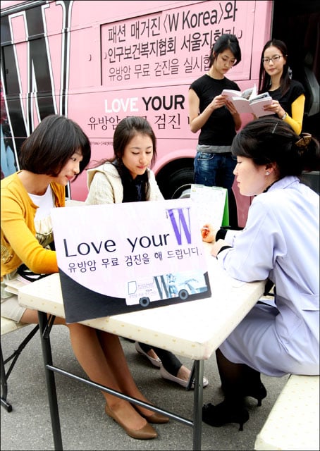 인구보건복지협회와 W코리아가 7일 오전 서울 종로구 배화여자대학교 앞 주차장에서 '무료 유방암 진단' 행사를 하고 있는 가운데 여학생들이 검사 신청을 하고 있다. 독자들의 PICK! "계산적" 주사이모, 박나래 전 매니저 저격에…"뭐가 그리 당당?" "성소수자 지인과 불륜"…최동석, 박지윤 상간소송 각하에 항소 '성범죄' 사촌오빠 결혼, 부모는 쉬쉬..."예비 새언니에 알릴까요" "아빠가 끔찍 성폭행" 친딸 임신시켰다...인면수심 父, 결국