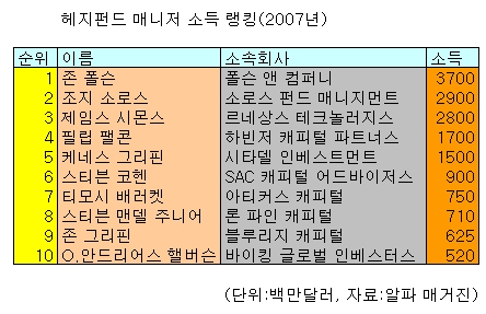 상위 5위권내에 드는 펀드매니저들은 JP모간 체이스의 베어스턴스 인수급액인 12억달러를 넘은 수입을 올렸다고 알파매거진은 전했다.