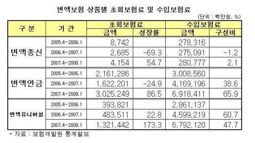 반면 변액종신보험은 수입보험료 기준으로는 미미한 실적을 보였다. 같은 기간 2808억원의 보험료를 거둬들여 2.1%의 증가율을 기록했다. 전년 동기의 1.2% 감소세와 큰 차이가 없다.