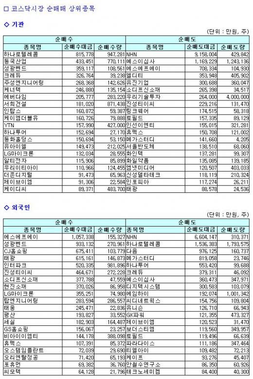 반면 기관은하나로텔레콤을 82억원 어치 사들이며 순매수 1위에 올려놨다. 이어동국산업(3,145원 ▲25 +0.8%)(43억원),성광벤드(35,100원 ▲1,050 +3.08%)(36억원),크레듀(27,350원 ▼250 -0.91%)(33억원),주성엔지니어링(60,700원 ▼3,500 -5.45%)(27억원) 순으로 순매수했다.
