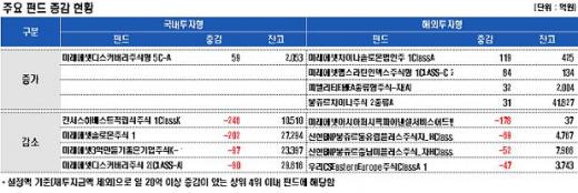 설정액 기준으로 '미래에셋차이나솔로몬법인주 1ClassA'는 119억원, '미래에셋맵스라틴인덱스주식형 1CLASS-C 2'는 84억원 증가했고, '피델리티EMEA종류형주식-자(A)'와 '봉쥬르차이나주식 2종류A'는 각각 32억원, 31억원 늘었다.