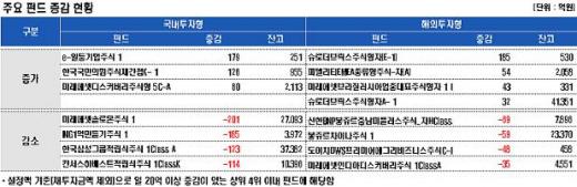 개별 펀드로는 '미래에셋솔로몬주식 1'의 설정액이 201억원 줄면서 가장 큰 폭으로 감소했고, 'ING1억만들기주식 1'과 '한국삼성그룹적립식주식 1Class A'도 각각 185억원, 123억원 줄었다.