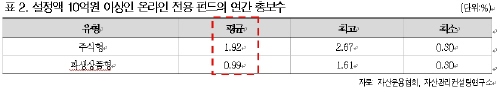 온라인 전용펀드는 보수 측면에서 돋보였다. 온라인 주식형펀드의 총보수 평균은 1.92%로, 전체 주식형펀드의 총보수 평균인 2.09%에 비해 저렴했다. 설정액 10억원 이상인 온라인 전용펀드와 동일한 오프라인 펀드 사이의 보수를 비교한 결과 온라인 전용펀드의 보수는 0.1%포인트~1.66%포인트 가량 낮았다. 보수 할인 폭은 6.64%~80.8%로 다양했다.