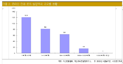 하지만 온라인 전용펀드 시장은 질적인 측면에서 성장이 요구된다는 지적이다. 설정액 1억원 미만인 펀드가 121개로, 전체 온라인 전용펀드의 42%를 차지한다. 1억~10억원 사이인 펀드는 82개로 28.8%로, 설정액 10억원 미만인 펀드가 전체의 71%에 달한다.